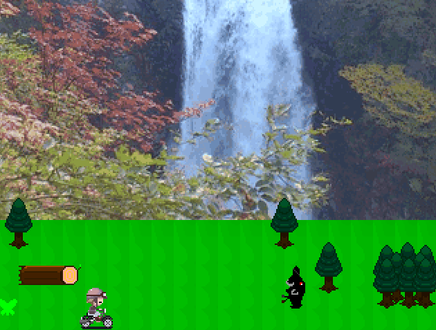 The green butterfly is unlocked by unlocking the Pink Butterfly. It takes the player to a secluded cliff-like area with a waterfall or a lake in the background. Approaching the edge will pan up the screen, showing more of the waterfall. There is a chance that the background will be a starry sky instead, interacting with it will teleport you to Candy World. There is a black rabbit-like creature in here which reacts to various effects: