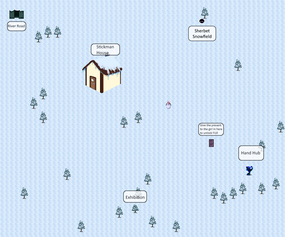 There is also a snow covered doorway to the southeast of the entrance that will take you to the River Complex, and a tree just southwest of the entrance that is smaller than the others, which will take you to the Exhibition.