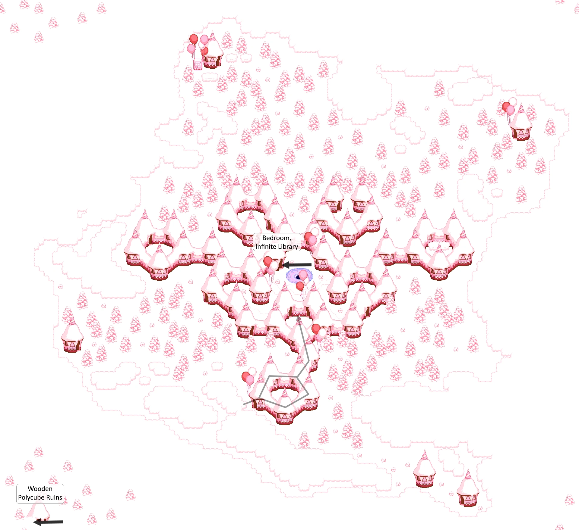 Located one screen north and a few second's travel west is a house partially buried in the clouds. It contains a kitchen and a refrigerator which, when opened, reveals a passage leading to an icy platform, where using the Teru Teru Bōzu to make it snow here will reveal a long set of stairs to the Wooden Polycube Ruins. You can also slide down the stairs with the Penguin effect.