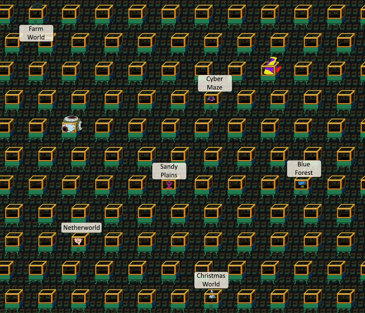 The area contains nothing but what appear to be yellow and green display units with the scrolling background containing these as well. Currently, seven of these are filled. In one, there are eyeballs protruding from it (pictured), and in another is a strange, multi-colored blob creature. One contains a face which transports you to the Netherworld. The next three contain trees: one is a Christmas Tree, one is a small light blue tree and the last is a taller dark tree. Interacting with them takes you to Christmas World, the Blue Forest, and Farm World respectively. The seventh unit contains a purple flower-like object that takes you to Sandy Plains, while the eighth and final unit is filled with a purple bat; interacting with it takes you to the Cyber Maze.
