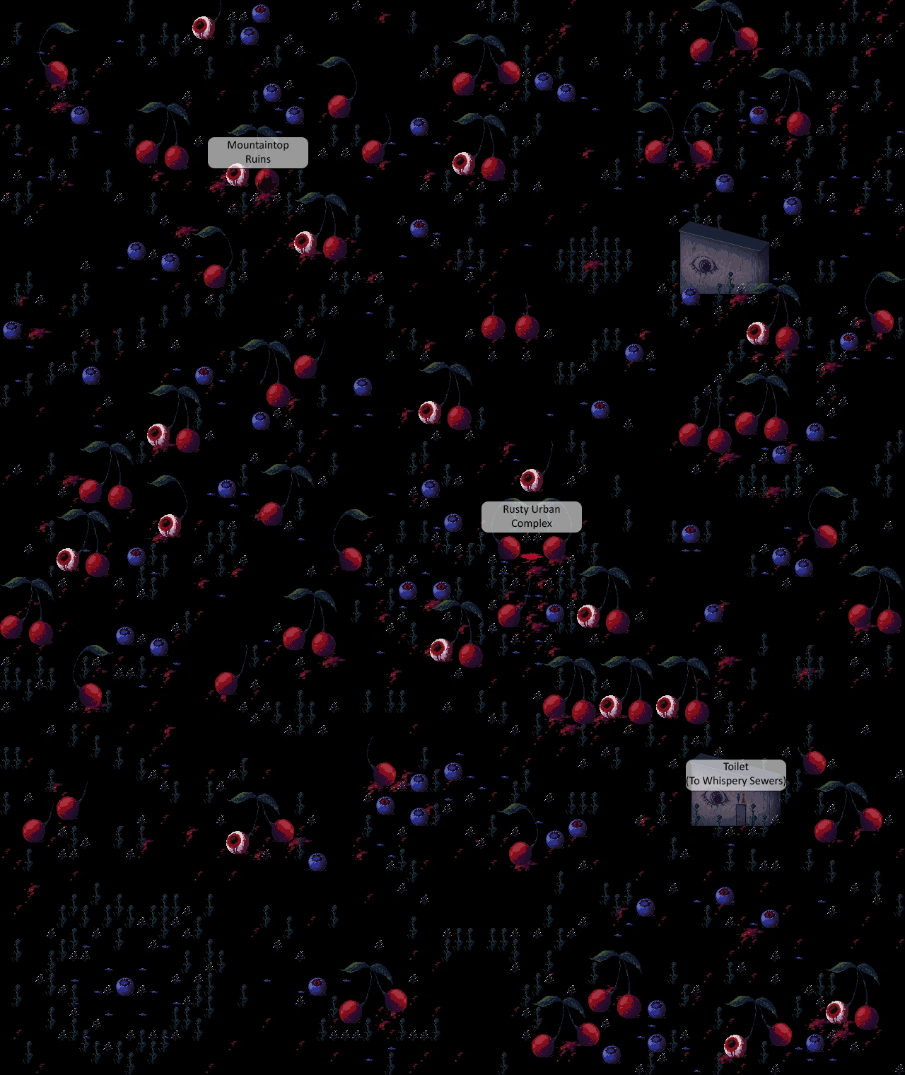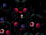 Eyeball Cherry Fields is a somewhat large, looping area with a dreary appearance, where you can find cherries and blueberries that may or may not have eyeballs in their place, gnarled vegetation, and puddles of blood. The berries with eyeballs can be chainsawed, and a relatively speedy Shadow Lady lurks the place, where getting caught by her will trap you in an isolated section.