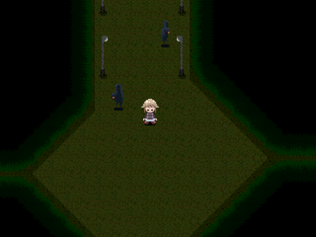 Passing by the table, on the other side of their parade is a well out in the middle of a large lake, with a rope coming out of it tied to a post by the shore. Interacting with the rope will untie it and you will hear a scream, implying that there was someone on the other end. After dropping the person down the well, a number of shadowy figures will appear and chase you if you try to leave the area down the long streetlight path, eventually capturing Urotsuki and forcing her to wake up and jump out of bed.