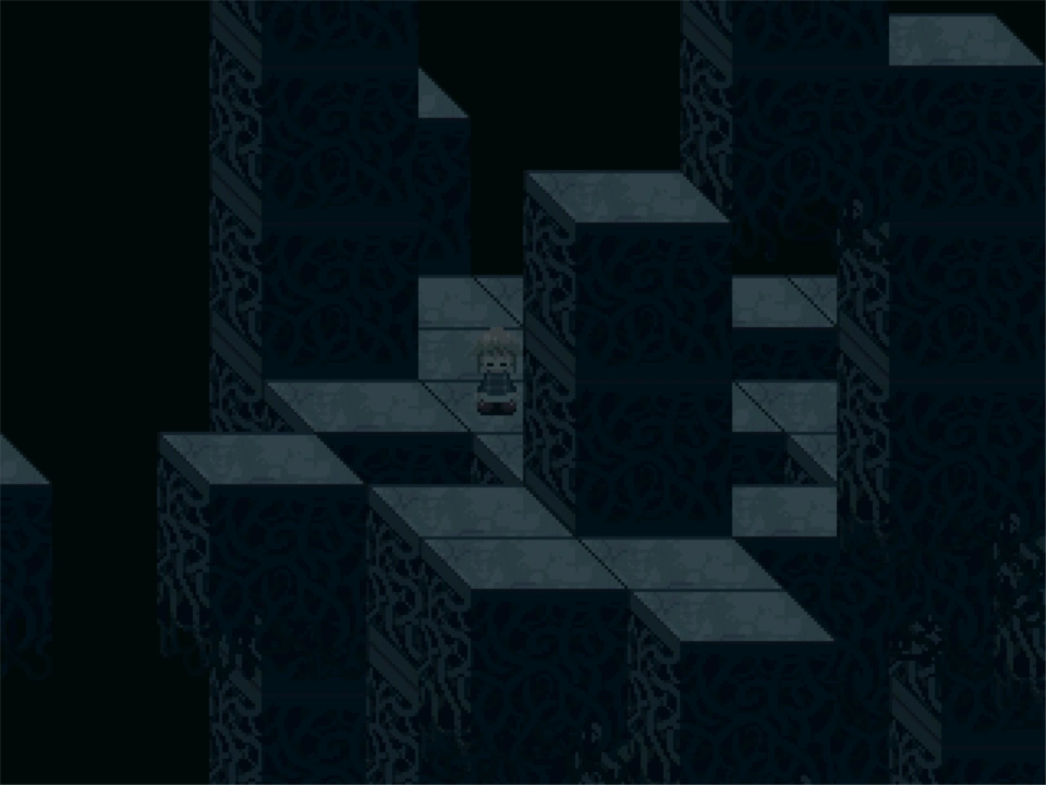 East-northeast of the entrance is a staircase to a floating cube that you can interact with. Backtracking after doing so will reveal a monstrous figure emerging from the staircase, and going further will take you to the Fossil Lake.