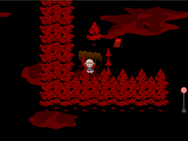 To the northwest of the entrance a large hole in the ground can be found sectioned off with traffic cones and a yellow sign. Urotsuki can walk past the cones under the treeline and enter the hole, which will take her to the Underground Caves.