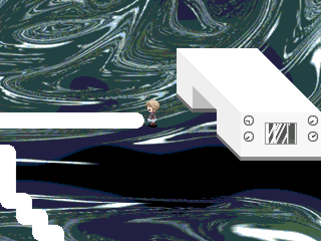 From this area, the Chainsaw effect can be obtained by stepping on the red teleporter located south-southwest of the entrance to the Hospital Outskirts. You'll be in a small area with lots of vomiting suits and a scrolling background (ゲロマーク祭, Geromāku-sai, Vomiting Mark Festival). By entering the mouth of one of the vomiting diamonds three times, you'll find a lone chainsaw which will give you the Chainsaw effect.