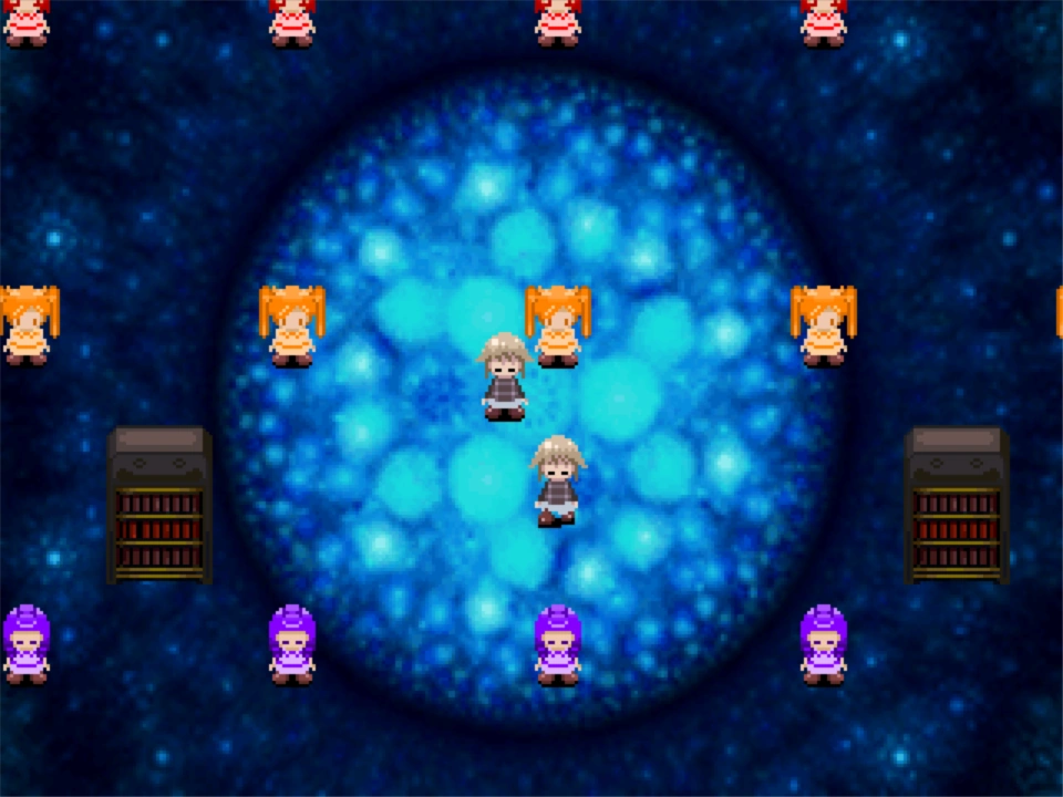 - In 0.101, there was a room exclusively accessible from the Fantasy Library, which contained a bed and a doll of Urotsuki, where exiting it would take you right next to the boarded-up door in the last hallway. From 0.101c, interacting with the Urotsuki doll took you to an area called the Puppet Room, an area with rows of differently-colored doll NPCs and an Urotsuki clone who copies the effects that Urotsuki is currently equipped with. Equipping the Chainsaw will make all the dolls face Urotsuki, and interacting with the book in the bookshelf will make the screen go white. For every row of dolls you chainsaw, the BGM's tempo will decrease and the panorama will change, and chainsawing all of the dolls will take you to a red-tinted empty space, which is the earliest incarnation of the Splash Streetway, where going down will wake you up, while going up will take you back to the room in the Hospital. This area was removed in 0.102a.