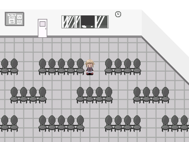 This area is quiet, which is to be expected from an area named after a characteristically quiet sort of place (that is, a hospital). When you walk in, there is a waiting room with a vending machine, rows of chairs, and a receptionist's window. An invisible nurse walks around this area, and a strange man with half a body may randomly appear beside the vending machine, along with the Mysterious Maid, who will give you 500夢 when interacted with for the first time. If you have the Glasses equipped, there will be a Landolt ring that will take you to Landolt Ring World upon interaction.