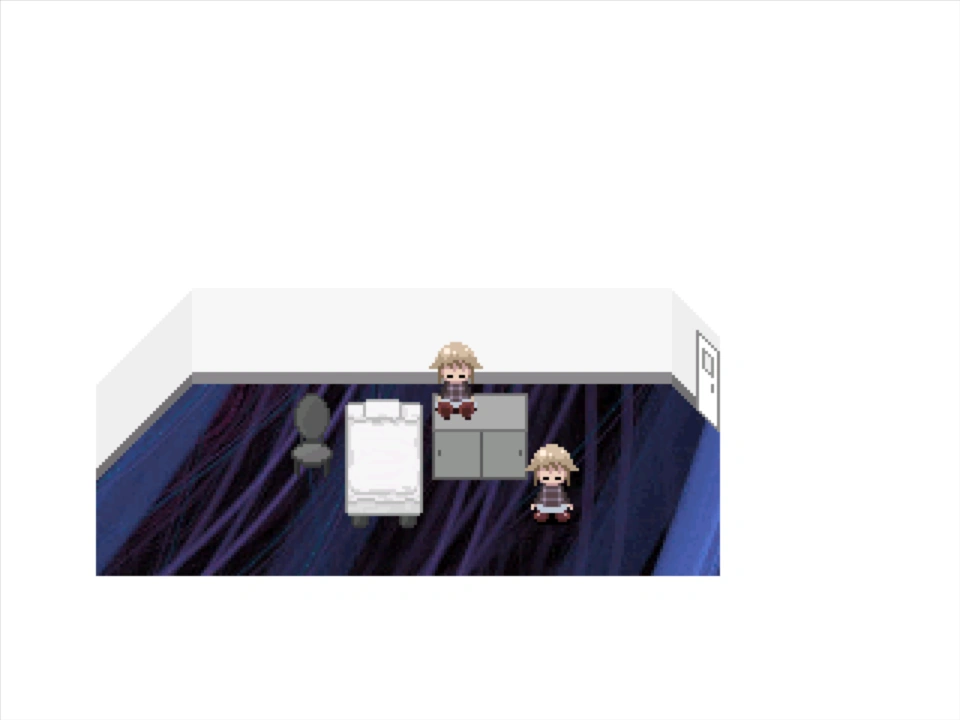 The second door of the first hallway will take you to a suspicious room with dim lights. Interacting with the furniture in this room will let you push it around. Pushing the bed and the cupboard each one block to the right will reveal a hidden red spot on the floor, and walking onto the red spot plays a heartbeat noise and makes the screen flash red.
