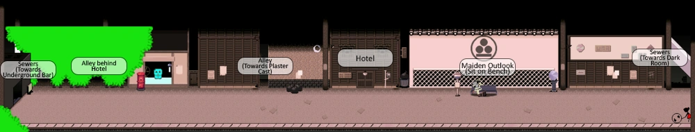 Atop the stairwell is the hotel lounge, where the rooms are located, currently being rented by various shadowy blob people. The individual rooms all have a futon, a chest of drawers, and a bathroom in the southeast corner of the room.