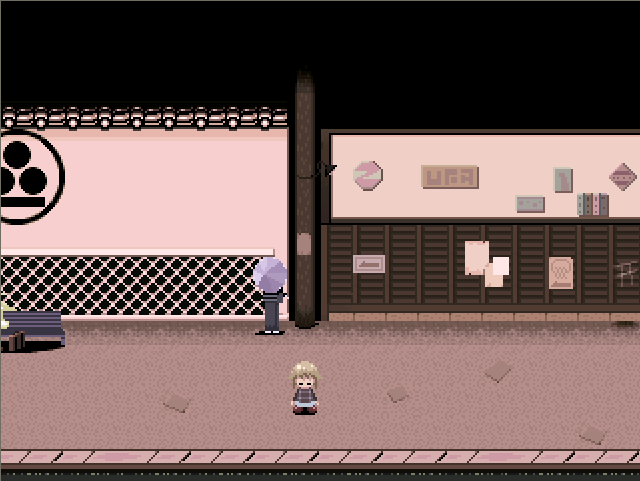 On the far right the back alley leads out into a dark looping area decorated with ladders, streetlamps and parts of various buildings. Heishi-Kun can be found here, who gives you the Plaster Cast effect when interacted with. If you chainsaw him, the atmosphere changes and flat Shadow Women will appear and chase you.