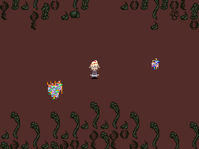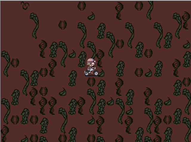 Once the player has found the clearing, they would be able to head south through more brush to find a smaller area, with a frowning face on the ground, visible if the player headed west at the blocked off portal back to Whipped Cream World instead of east. Using the Glasses effect in the northern wall of boxes will reveal that there are evil spirits dwelling behind them. By heading all the way south from here, the player could access a small room with a strange grey and red door on the other side, blocked by a traffic cone, which transforms into a butterfly if the Chainsaw is equipped, which can then be killed.