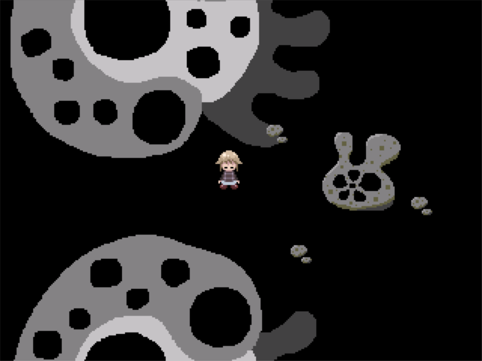 Rock World is a looping, barren area with triangular rocks dotting the place, where stones surround these rocks. One landmark here is a large rock with ears resembling that of a rabbit's, and some holes on its front. Slightly southwest of this rock is a blue creature who will take you to Rainbow Tiles Maze upon interaction. Northeast of this creature is a castle that leads to the Theatre World. This world also features a floating spherical green creature holding a heart (initially only visible with the Glasses effect), who will take you to the Sanctuary upon interaction. Just north of said creature is an orange bird that will take you to the Sunset Rooftops (夕焼け屋上), and southwest is a vase that leads to Entomophobia Realm. Southwest of that vase is a piece of meat that leads to Vermilion Bamboo Forest.