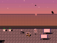 Sunset Rooftops is a small area with potted plants, a telescope and a painting of outer space, next to pair of clothes being dried, as well as a crow on top of the fence (which will flap its wings when pressing the action button with the Bike, Wolf, Telephone, and Trombone effects, and its eye will turn red when using the Bug effect). The Teru Teru Bōzu and the Tissue effect are equippable but not usable here (the Tissue effect due to not having any tissues in the box). Normally, you can see a lady on the same row as the fence's broken part, but there is a 21.56% chance determined per dream session that she wouldn't show up, with a UFO taking her place, floating just above that broken part. Interacting with the fence with the Spacesuit effect will take you to the Visine Spacecraft, with the lady standing in the northern section. With the Glasses, a ladder to the skies will be revealed, and interacting with it is a one-way trip to the Starfield Garden.