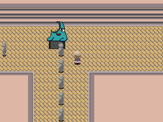 The area is simply a T-junction with yellow paving stones and pinkish buildings. There are a number of grey people lining up in front of a counter where a blue blob creature with one eye seems to be telling them which way to go.