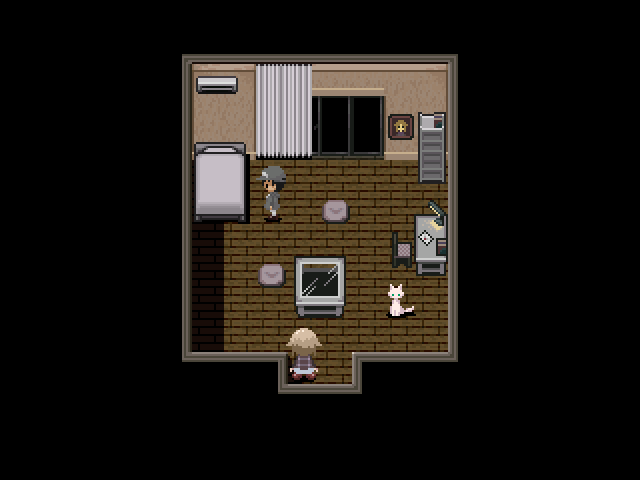 Despite Urotsuki's reaction, interacting with the computer has a 1 in 10 chance of taking her to a smaller bedroom, similar in appearance to her own. Interacting with the NPC in this room will unlock two new menu graphic set options on the in-game computer. Equipping the Chainsaw effect in this room will make the boy flash red and force Urotsuki to put away the chainsaw. The doors at the back of the room lead to a balcony similar to Urotsuki's, while the doors at the front will take you back to Urotsuki's bedroom, bleak edition. This room could possibly be referencing an old, beta version of Urotsuki and her room.