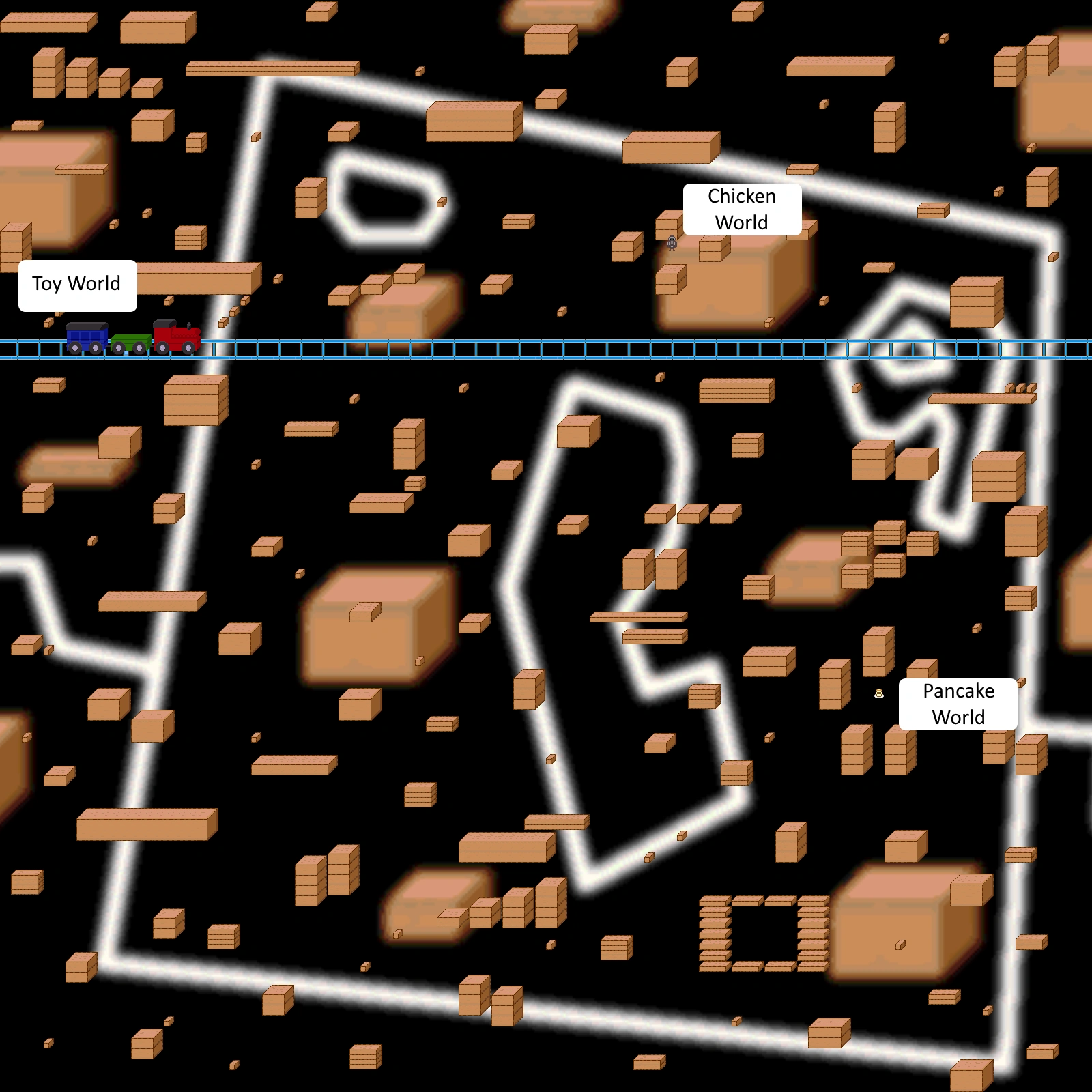 Wooden Block World is a looping world scattered with blocks of wood, many of which are stacked. The environment resembles the Toy World before it. By heading southwest of the train, you can find a pancake in the middle of five stacked blocks, leading to the Pancake World. East of the train, from the upper side of the train tracks, there is an ash-colored chicken that takes you to Chicken World upon interaction.